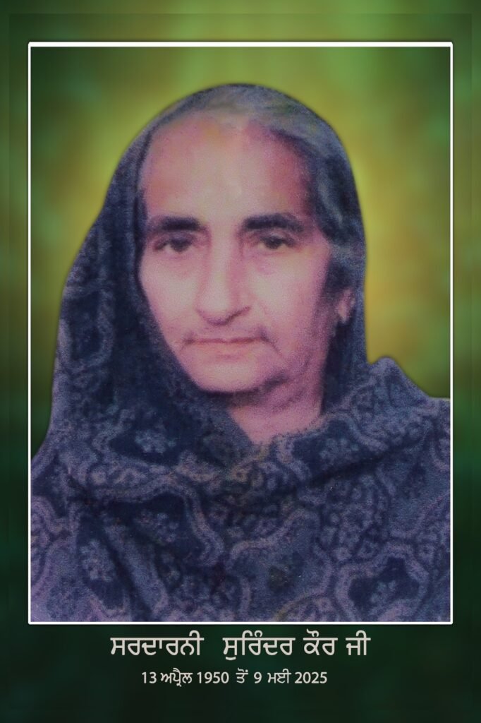 ਸਾਦਗੀ ਦੀ ਮੂਰਤ , ਨੇਕ ਦਿਲ , ਹੱਕ ਸੱਚ ਨੂੰ ਸਮਰਪਿਤ, ਹਰ ਦਿਲ ਅਜ਼ੀਜ਼ ਬਹੁਤ ਹੀ ਸਤਿਕਾਰਯੋਗ ਮਾਤਾ ਸੁਰਿੰਦਰ ਕੌਰ ਜੀ ਜੋ 9 ਮਈ 2025 ਦਿਨ ਸ਼ੁੱਕਰਵਾਰ ਨੂੰ ਅਕਾਲ ਪੁਰਖ ਵੱਲੋਂ ਬਖਸ਼ੀ ਸੁਆਸਾਂ ਦੀ ਰਾਸ ਪੂੰਜੀ ਸੰਪੂਰਨ ਕਰਦੇ ਹੋਏ ਇਸ ਫਾਨੀ ਸੰਸਾਰ ਨੂੰ ਅਲਵਿਦਾ ਆਖ ਗਏ । ਉਨ੍ਹਾ ਦਾ ਜਨਮ 13 ਅਪ੍ਰੈਲ 1950 ਨੂੰ ਮਾਤਾ ਹਰਕ੍ਰਿਸ਼ਨ ਕੌਰ ਦੀ ਕੁੱਖ ਤੋਂ ਪਿਤਾ ਸਵ. ਸ੍ਰ .ਕਰਤਾਰ ਸਿੰਘ ਦੇ ਗ੍ਰਹਿ ਮੁਜੱਫਰਨਗਰ ਯੂ ਪੀ ਵਿੱਚ ਹੋਇਆ। 15 ਅਕਤੂਬਰ 1971 ਨੂੰ ਸੰਤ ਪ੍ਰੀਤਮ ਸਿੰਘ ਜੀ ਸੀਕਰੀ ਵਾਲਿਆ ਦੀ ਅਗਵਾਈ ਵਿੱਚ ਆਪ ਜੀ ਦਾ ਅਨੰਦ ਕਾਰਜ ਸ.ਕਸ਼ਮੀਰ ਸਿੰਘ ਨਿਵਾਸੀ ਪਿੰਡ ਆਲਮਗੀਰ ਡਾਕਘਰ ਕਾਲਾ ਬੱਕਰਾ ,(ਜਿਲਾ ਜਲੰਧਰ ) ਨਾਲ ਹੋਇਆ। ਆਪ ਜੀ ਨੇ ਗ੍ਰਿਹਸਤ ਜੀਵਨ ਗੁਰ-ਉਪਦੇਸ ਅਨੁਸਾਰ ਬਤੀਤ ਕਰਦੇ ਹੋਏ, ਆਪਣੇ ਦੋਨੋ ਪੁੱਤਰਾਂ ਨੂੰ ਗੁਰਮਤਿ ਦੇ ਧਾਰਨੀ ਬਣਾਇਆ । ਆਪ ਜੀ ਦੇ ਵੱਡੇ ਸਪੁੱਤਰ ਭਾਈ ਰਵਿੰਦਰ ਸਿੰਘ ਆਲਮਗੀਰ ਸਾਬਕਾ ਪ੍ਰਚਾਰਕ ਧਰਮ ਪ੍ਰਚਾਰ ਕਮੇਟੀ ( ਸ੍ਰੋ. ਗੁ.ਪ੍ਰ. ਕਮੇਟੀ ) ਸਮੇਤ ਪਰਿਵਾਰ ਸਰਬਜੀਤ ਕੌਰ ਪਤਨੀ,ਬੱਚੇ ਅਨਮੋਲ ਸਿੰਘ , ਏਕਜੀਤ ਕੌਰ ਹਾਲ ਨਿਵਾਸੀ ਜਰਮਨੀ ਜੋ ਯੂਰਪ ਵਿੱਚ ਗੁਰਮਤਿ ਪ੍ਰਚਾਰ ਦੀ ਸੇਵਾ ਨਿਭਾਅ ਰਹੇ ਹਨ । ਸਮੂਹ ਪਰਿਵਾਰ ਸ. ਕਸ਼ਮੀਰ ਸਿੰਘ (ਪਤੀ) , ਭਾਈ ਰਵਿੰਦਰ ਸਿੰਘ, ਰਜਿੰਦਰ ਸਿੰਘ (ਪੁੱਤਰ ) , ਸਰਬਜੀਤ ਕੌਰ (ਨੂੰਹ ) , ਅਮਨਦੀਪ ਕੌਰ (ਨੂੰਹ), ਅਨਮੋਲ ਸਿੰਘ , ਸੁਖਪਾਲ ਸਿੰਘ ਜਰਮਨੀ (ਪੋਤਰੇ), ਏਕਜੀਤ ਕੌਰ ਜਰਮਨੀ ਅਤੇ ਲਵਪ੍ਰੀਤ ਕੌਰ (ਪੋਤਰੀਆਂ) ਸਮੂਹ ਪਰਿਵਾਰ ਵੱਲੋਂ ਮਾਤਾ ਸੁਰਿੰਦਰ ਕੌਰ ਜੀ ਨਮਿਤ ਆਰੰਭ ਸਹਿਜਪਾਠ ਦੀ ਸੰਪੂਰਨਤਾ 18 ਮਈ 2025 ਦਿਨ ਐਤਵਾਰ ਉਨ੍ਹਾ ਦੇ ਗ੍ਰਹਿ ਵਿਖੇ ਹੋਵੇਗੀ। ਉਪਰੰਤ ਸ਼ਬਦ ਕੀਰਤਨ ਅਤੇ ਅੰਤਿਮ ਅਰਦਾਸ ਗੁਰਦੁਆਰਾ ਸਾਹਿਬ ਆਲਮਗੀਰ-ਜਲਾਲਾਬਾਦ ਵਿਖੇ ਹੋਵੇਗੀ ।